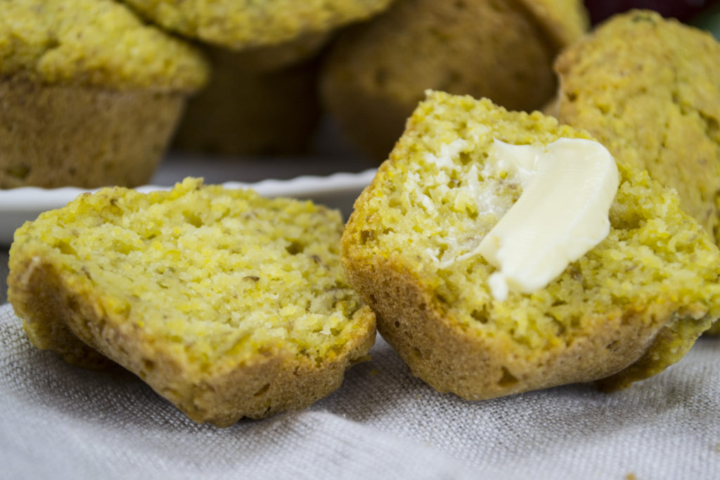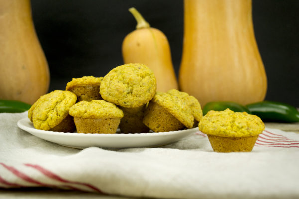 A lovely combination: moist and soft on the inside with the nutritional addition of sweet butternut squash and flax, with a crispy outer edge highlighted by the crunch of cornmeal. Baking these in small (half size) cupcake pans provides lots of outer crunchiness!